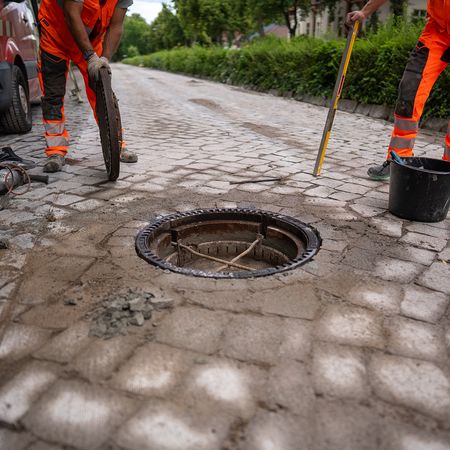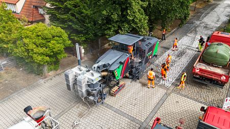 Zur Vorbereitung der Schleifarbeiten erfolgte das manuelle Anheben Pflastersteine, um unnötig tiefe Fräsarbeiten zu vermeiden. Vorhandene Gullydeckel wurden gegen fräsbare Blindstopfen ausgetauscht.