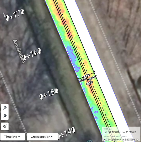 In Kooperation mit der Fräsdienst-Service E. Feind GmbH sollten in Eichwalde erstmals moderne Vermessungs- und Simulationsmethoden angewendet werden, um die Maßnahme für kommunale Planungsprozesse greifbarer zu machen. Die präzise Vermessung ermöglicht Rückschlüsse auf zentrale Aspekte wie den Querschnitt der Straßenoberfläche, das Abflussverhalten von Regenwasser nach der Reprofilierung und die Lokalisation punktuell notwendiger Anhebungen. So lassen sich sowohl die Planungssicherheit als auch die Qualität der baulichen Umsetzung deutlich verbessern.